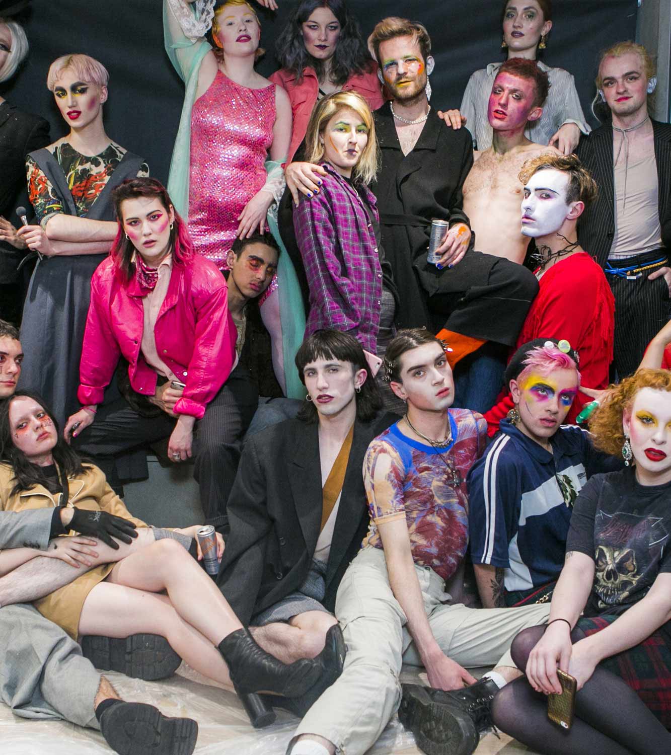Makeup artist Lucy Bridge has worked with Jeffrey for the last two seasons (and is responsible for the glitter and face paint that adorns his models), but she has known the designer for over nine years. Aptly, they met at a house party when she was living about the iconic, now shuttered, gay venue The George & Dragon. “The makeup we do with Jeffrey is very unconventional,” she explains. “I’m a Virgo so I like to be very precise with what I’m doing, but sometimes Jeffrey will come over and he’ll mess it all up – but it looks amazing! We work well together in that way – it’s a combination of us both.” Think of it as makeup to transform or surprise, rather than makeup to accentuate or flatter. “It’s always about the character – what clothes they’re wearing, what hair they have, who they are…that’s what defines it.”