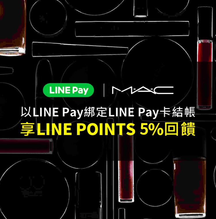 立即搶購暢銷熱賣商品1. 透過LINE Pay我的條碼綁定中國信託LINE Pay聯名卡,至MAC品牌官方網站筆筆享LINE POINTS 5%回饋。2. 實際參加加碼回饋活動之品項,請依各品牌官方網站公告為準。3. LINE POINTS 5%點數回饋=本活動加碼4%點數回饋+原中國信託LINE Pay卡一般消費1%點數回饋。回饋皆以實際LINE Pay綁定卡片支付之新臺幣金額乘以指定回饋%後四捨五入計算。交易已使用LINE POINTS點數折抵的金額,恕不計入LINE POINTS點數回饋活動。4. 活動加碼4%點數回饋:回饋時間為付款成功24小時後陸續發放,原中國信託LINE Pay卡一般消費1%點數回饋:將於商店請款完成(約5至7個工作天)後陸續發放。5. 活動僅限臺灣LINE帳號且已註冊LINE Pay的用戶參加,請務必於結帳前完成註冊LINE Pay。6. 參加活動前請務必確認是否已同意LINE Pay行銷資訊提供政策。提醒您,必須同意行銷資訊提供政策,才可獲得活動回饋(包含但不限於LINE POINTS 點數、貼圖、一卡通帳戶儲值金等LINE Pay行銷活動獎勵)。欲確認是否已同意LINE Pay行銷資訊提供政策,請更新LINE應用程式至最新版本,並進入LINE Pay主頁,依序點選「設定」>「服務條款」>「行銷資訊提供政策」,即可查看是否有勾選同意,有打勾代表已同意。7. 限透過LINE Pay「我的條碼」付款。活動資格係以「LINE Pay」>「交易紀錄」>「付款詳細資訊」內的付款日期及交易完成日期之時間認定。8. 本活動不適用任何分期付款(含後續單筆分期、帳單分期),亦不得滯納繳款,方得享有優惠。9. 本優惠回饋之LINE POINTS點數不得兌換現金、不可轉讓或出售,並且在法律禁止的地區無效。嚴禁以不當方式使用本優惠,如有違反,中國信託銀行及LINE有權取消持卡人LINE POINTS點數回饋活動之資格並要求返還已回饋之LINE POINTS點數,如點數不足扣回,將以1點1元的方式向持卡人帳單收取。10. 詳細加碼活動辦法請參閱中國信託銀行官網公布之『中國信託LINE Pay卡 2019年行銷加碼回饋』及『中國信託LINE Pay卡回饋計畫』。11. 如遇不可抗力或不可歸責之事由,中國信託銀行及MAC得保留修改、變更或終止本活動。